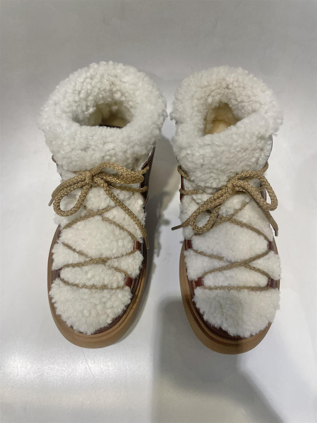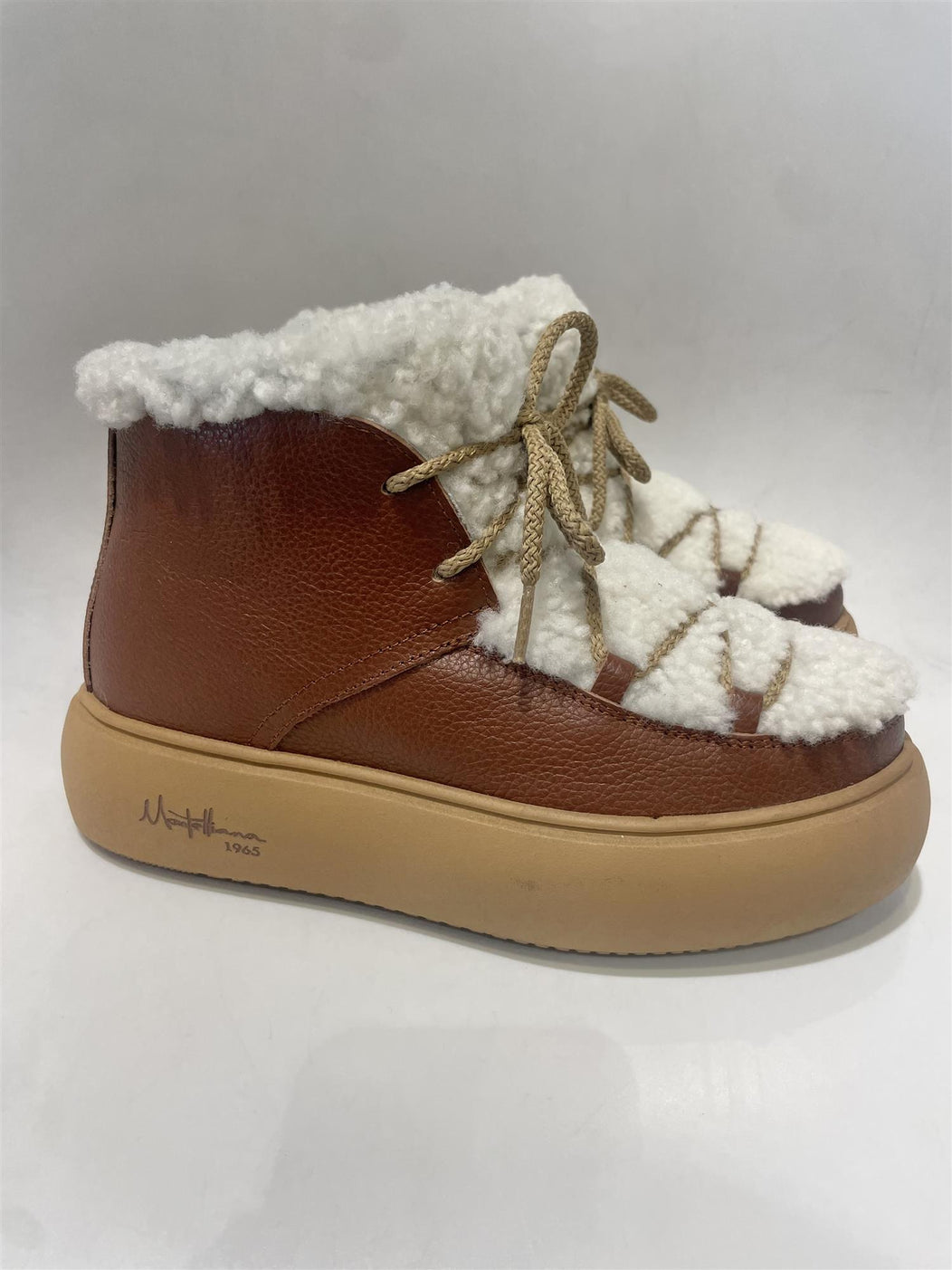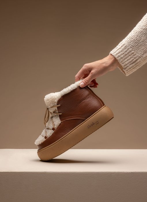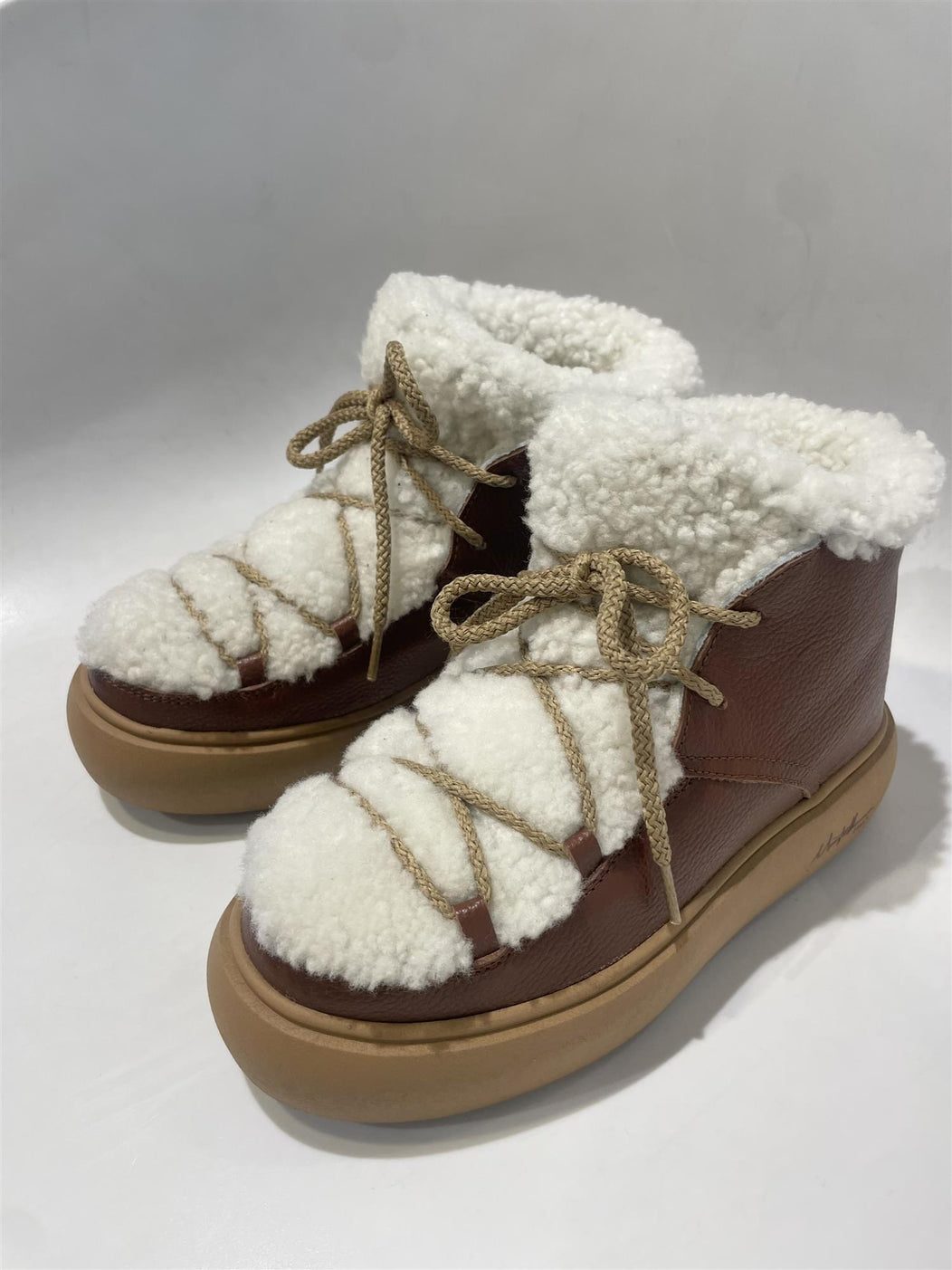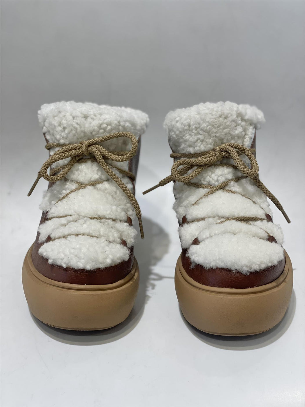 DESCRIPTION: Model Name: GAIA Design: Hybrid low boot blending functionality and style. Upper: Crafted from goat and calf suede for a premium finish. Lining: Wool-blend with shearling edge for superior insulation and added comfort. Sole: Equipped with a TermoRubber sole for enhanced grip on slippery surfaces. Heel Type: Integrated wedge for added height and comfort. Waterproof Construction: Keeps moisture out, ensuring dry feet even in heavy snowfall. Insulation: Wool-blend lining traps heat to provide maximum coziness in cold conditions. Conscious Curation: Designed with care, using premium materials to ensure durability and sustainability.