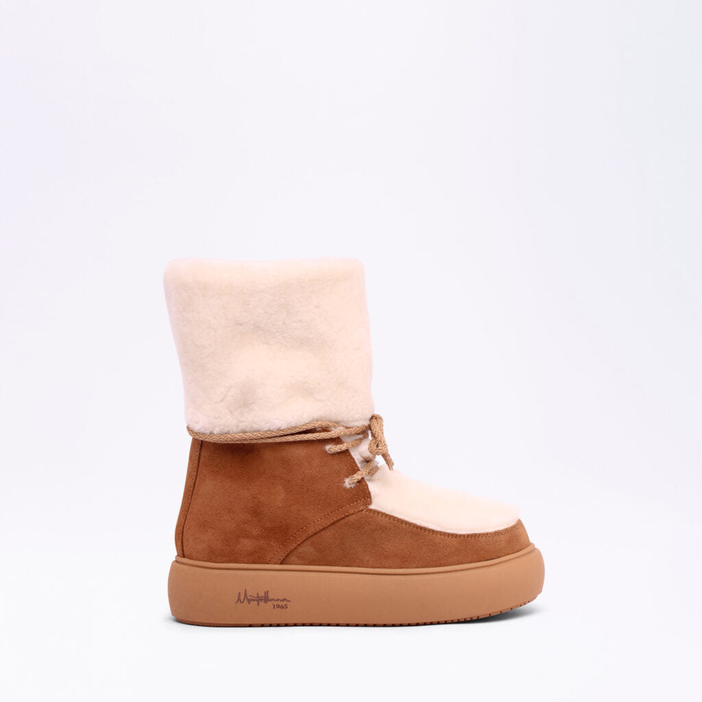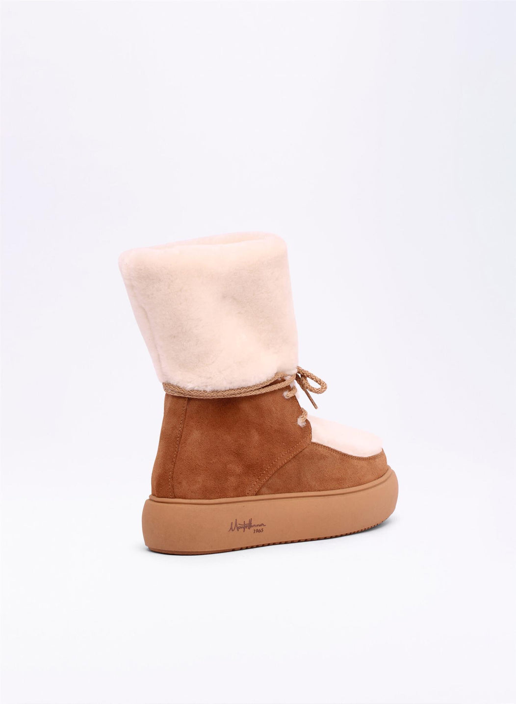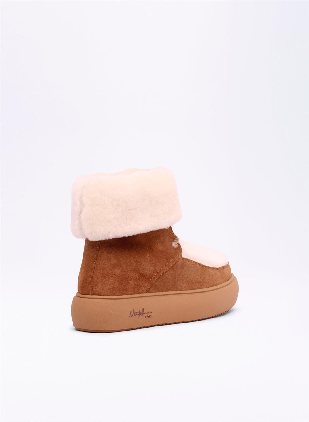 DESCRIPTION: Design: Hybrid slip-on boot combining functionality and luxury, perfect for a refined yet practical look. Materials: Crafted from premium goat leather, with an upper made of plush shearling that adds a soft texture and an elegant touch to any outfit. Waterproof Construction: Ensures complete protection from moisture, keeping feet dry and comfortable in wet and snowy conditions. Comfort & Style: The slip-on design enhances convenience, while the premium materials and embellishments elevate the overall sophistication. Sustainability: Created with a conscious approach, using high-quality and responsibly sourced materials for durability and reduced environmental impact.