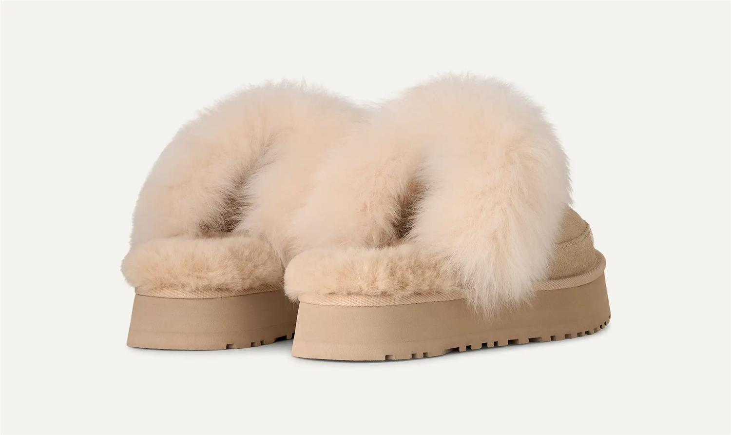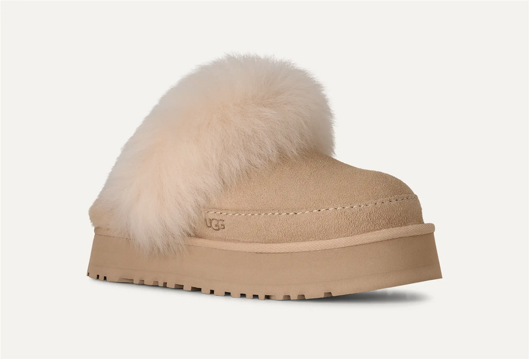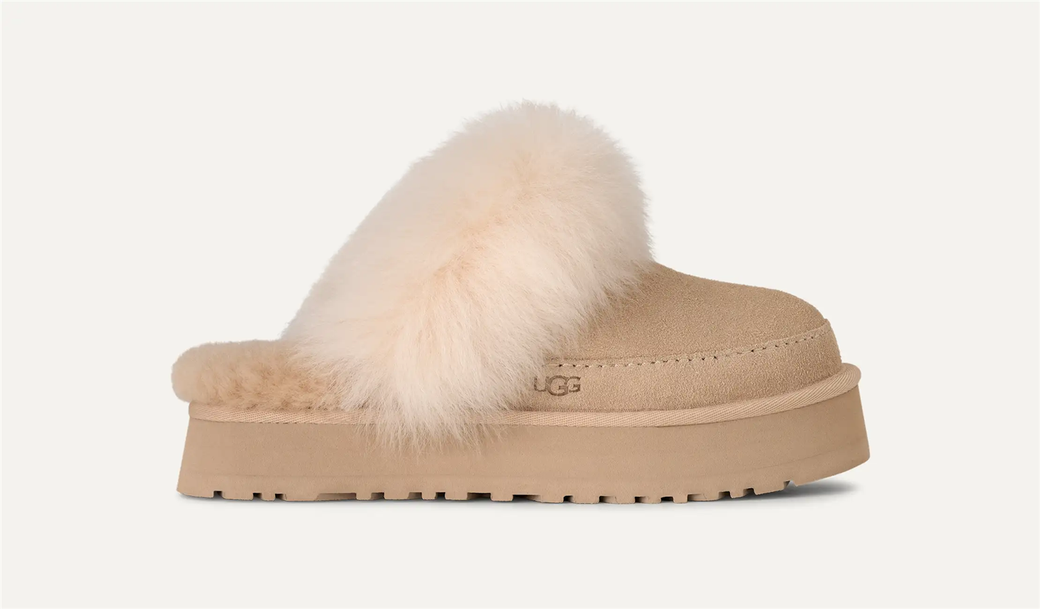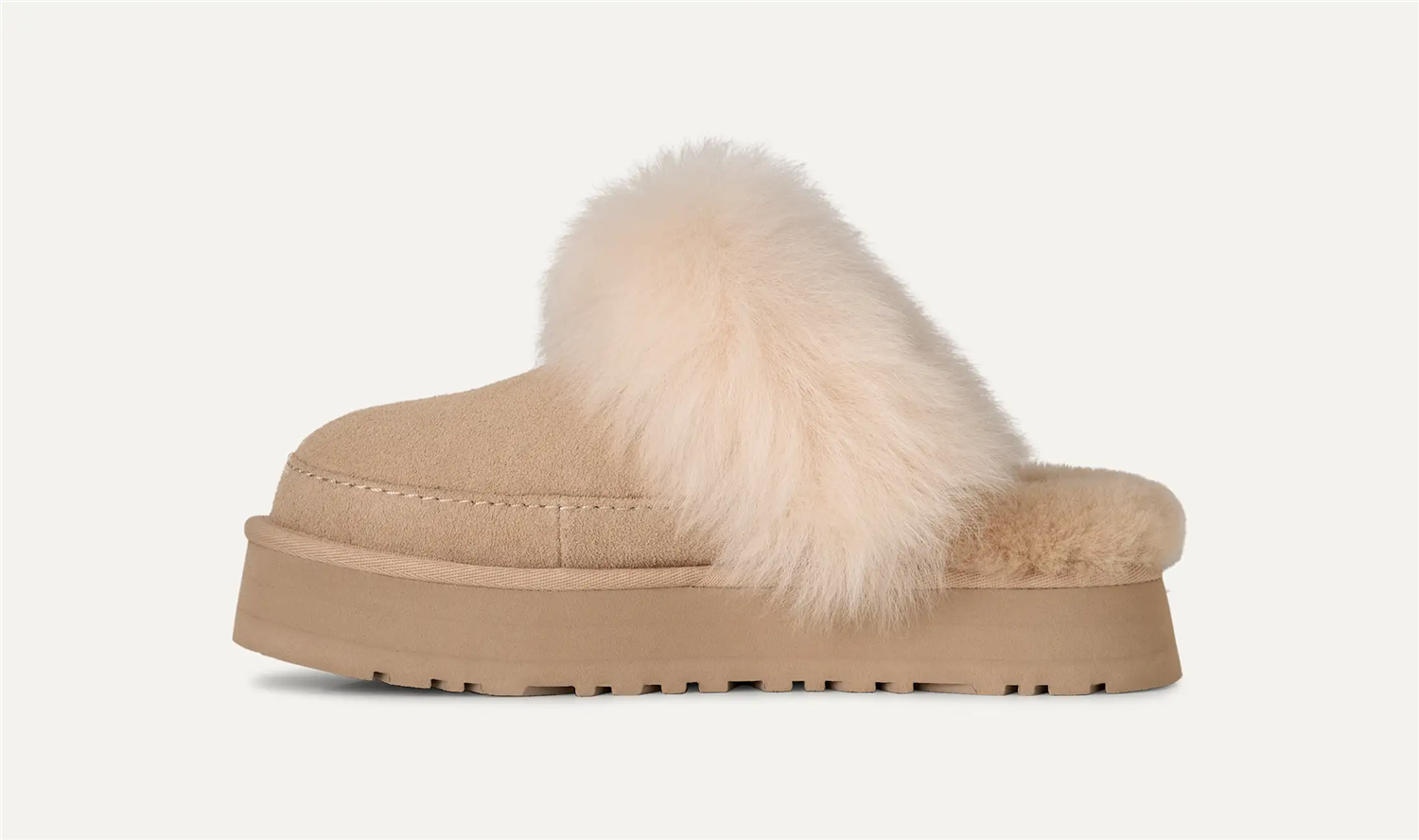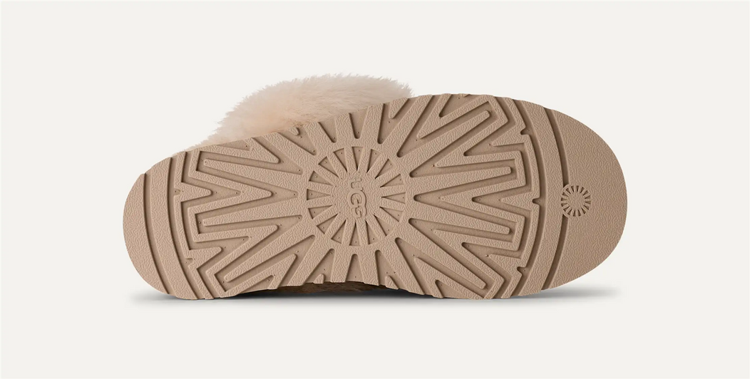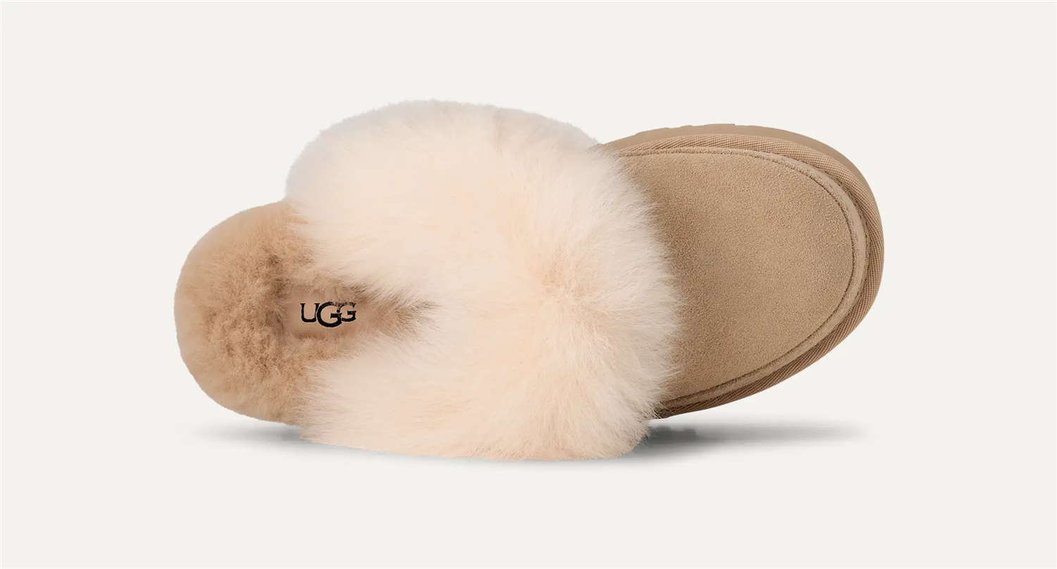 When the weather outside is frightful, our Disquette Chalet is so delightful. This decadent slipper delivers surrounding warmth, from the sheepskin insole and UGGplush™ lining to the fluffy sheepskin collar. Designed to be worn both indoors and out, it's set upon a 1" platform made from lightweight (and super cushy) sugarcane EVA.