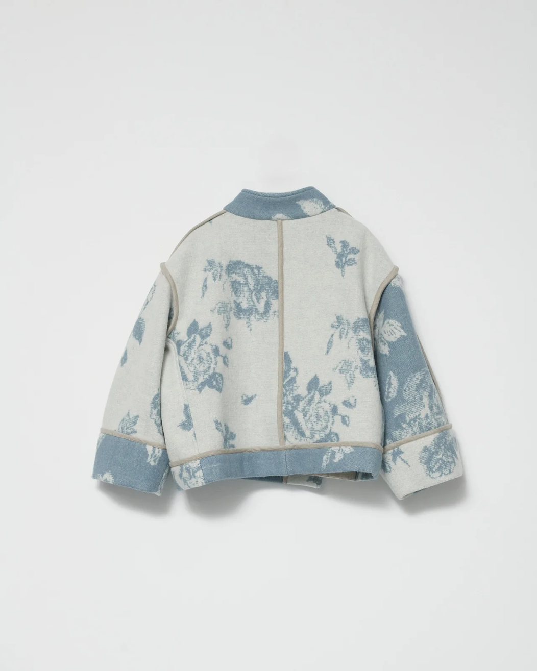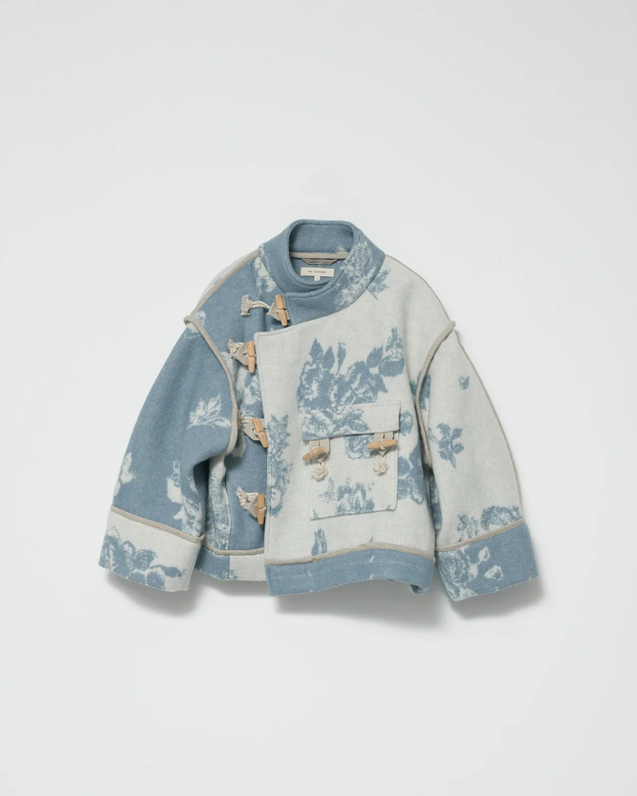 Klippan BOILED WOOL JACKET WITH LARGE FLOWER PRINT. THE JACKET HAS ASYMMETRICAL WOOD TOGGLES CLOSURE, A LARGE FRONT POCKET AND TWO SIDE POCKETS.