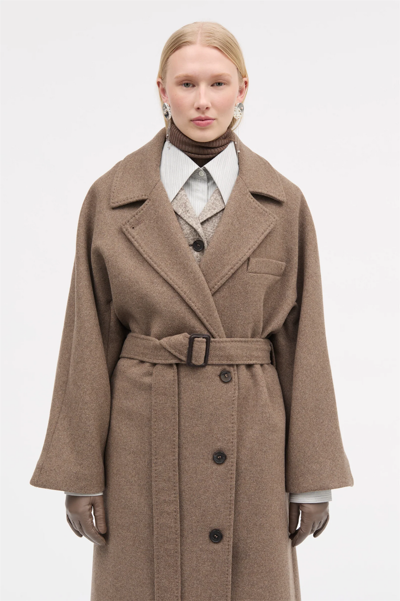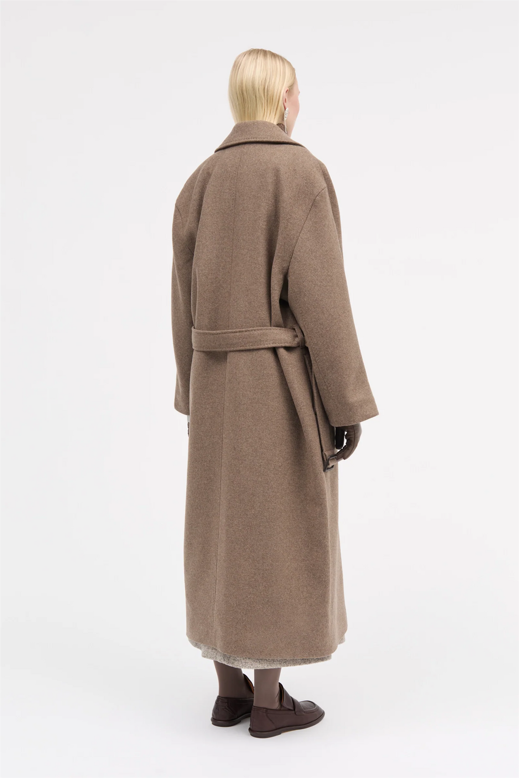 Discover timeless elegance with this taupe long easy double-breasted coat, designed for the modern woman who appreciates minimalist luxury. Its refined silhouette and architectural form are perfect for any season.